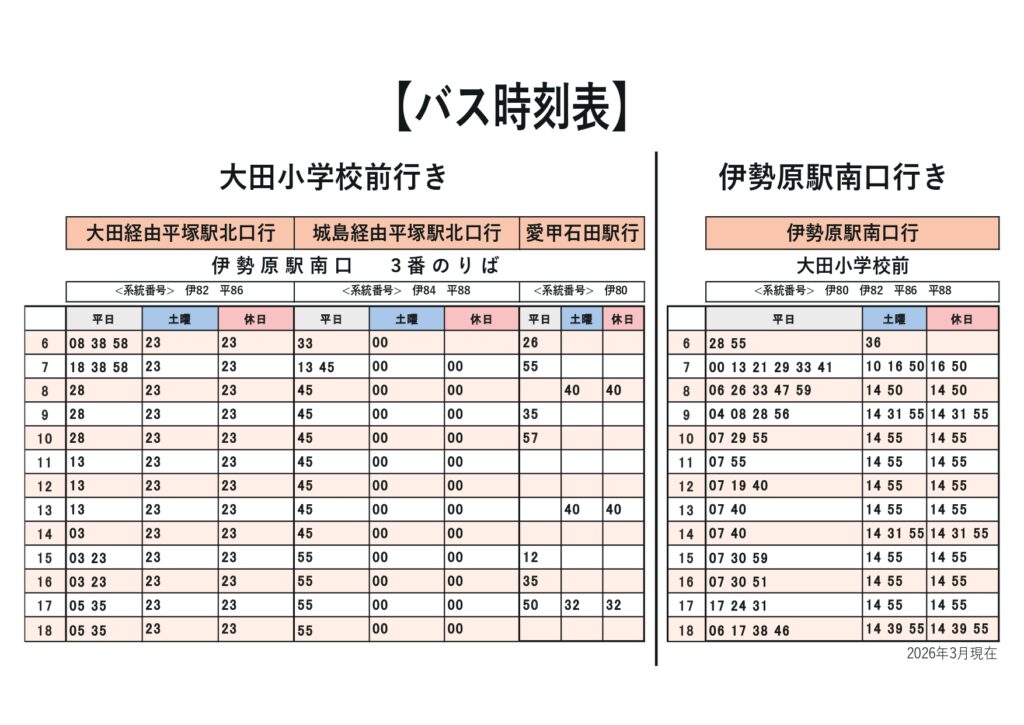 伊勢原駅南口3番乗り場から「平塚駅北口行(大田・横内経由)」,「平塚駅北口行(城島・八間通り経由)」、「愛甲石田駅行」バスに乗り、約7分の「大田小学校前」で下車します。