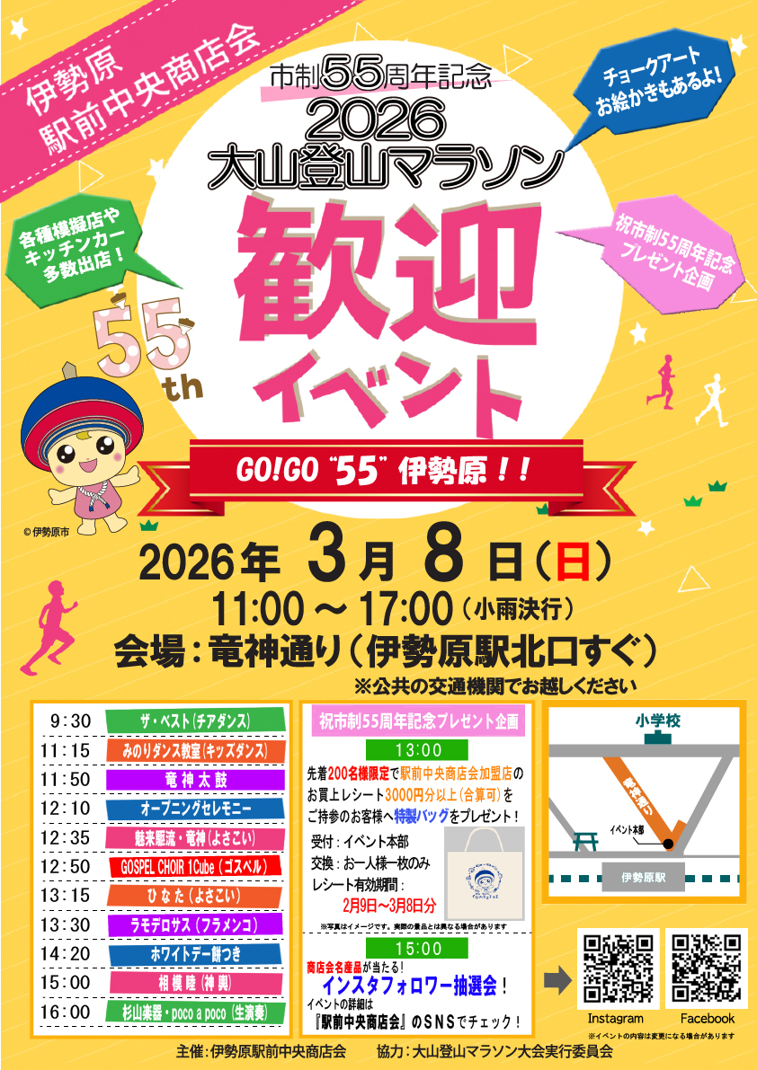 2026年3月5日 / 最終更新日時 : 2026年3月5日 伊勢原市観光協会 ニュース 【駅前中央商店会】大山登山マラソン歓迎イベント(3/8) 大山登山マラソン大会の開催に合わせて、駅前中央商店会が歓迎イベントを開催します。 伊勢原駅北口「竜神通り」を会場として、各種ステージパフォーマンスやキッチンカーの出店などが行われます。 詳しくは「駅前中央商店会」のInstagram、facebookをご覧ください。